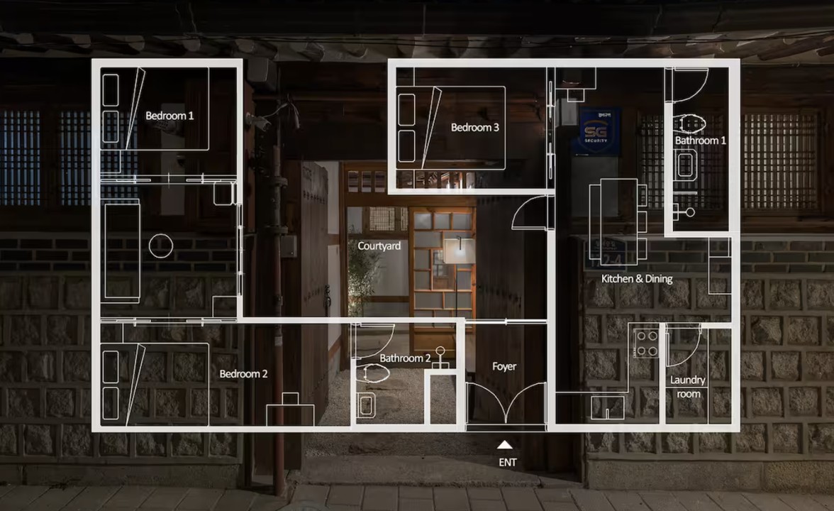 고를 때는 나름 심각했는데 돌이켜보니 사실 이 부분에 있어선 한옥의 특성상 어디든 웬만하면 다 맘에 들지 않았을까 싶다. 진짜 큰 대저택이 아닌 이상 일반 가옥의 경우 보통 한 건물당 2-3개의 방이 있고 두 개 정도로 분리된 건물 두 개가 중정을 끼고 마주 보고 있는 경우가 많기 때문이다.