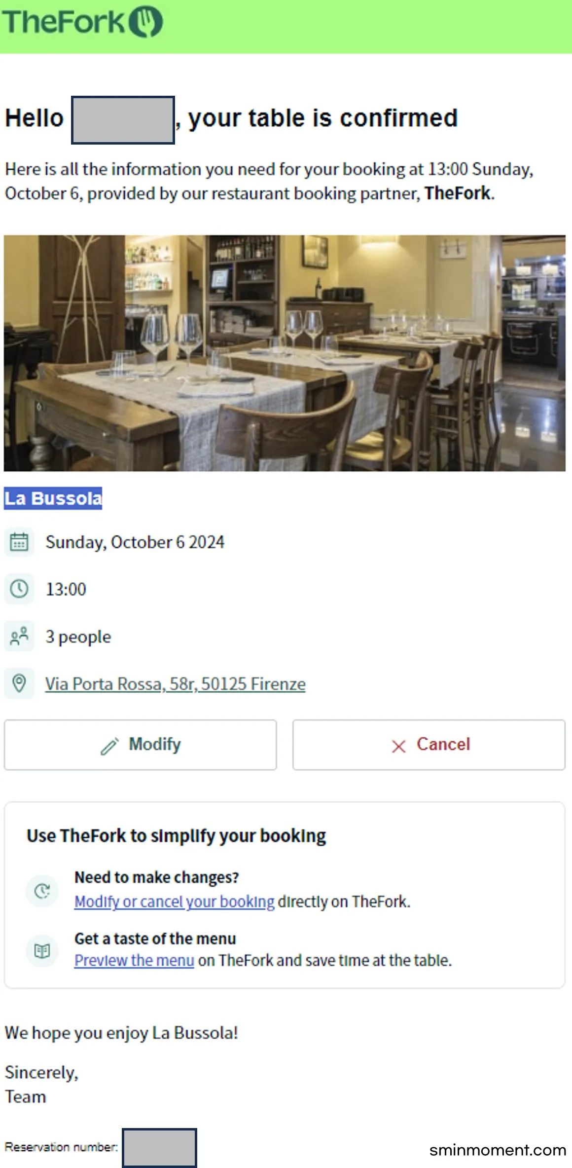 우리는 여행의 둘째 날 점심에 신랑과 나 그리고 9살 아이까지 3명을 예약했다. 예약할 때는 'TheFofk'  더포크 앱을 이용했는데 날짜 누르면 예약가능 시간대를 선택할 수 있고 인원 및 추가 정보 넣으면 완료되니 굉장히 직관적이고 간편했다. 예약이 확정되면 위와 같은 내용을 메일로 받아둘 수 있다.